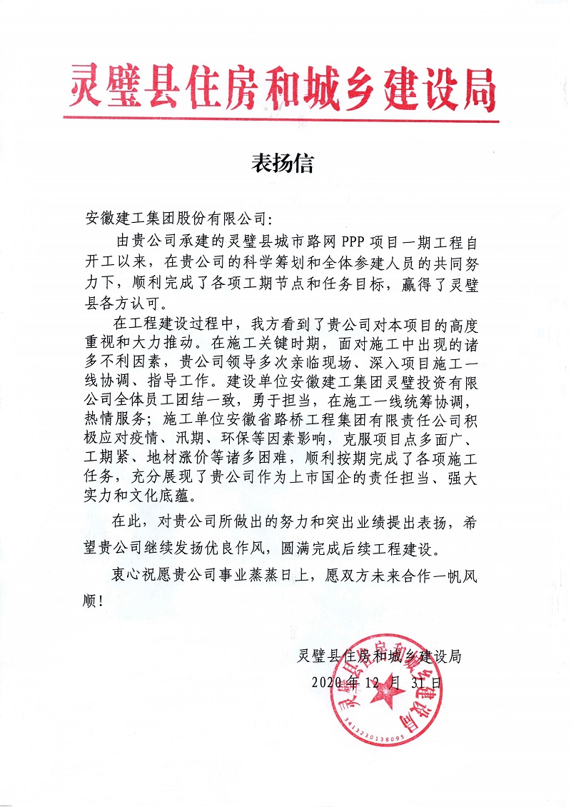 12月31日,靈璧縣住房和城鄉建設局向安徽建工集團股份有限公司發來表揚信,高度贊揚了公司投資建設的靈璧縣城市路網PPP項目一期工程2020年取得的優異成績,充分肯定安徽建工的建設實力、責任擔當和良好企業形象。