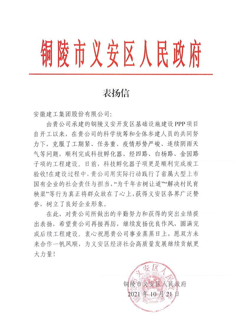 10月21日,銅陵市義安區政府向安徽建工集團股份有限公司發來表揚信,高度認可并贊揚了公司投資建設的義安區城市基礎設施建設PPP項目工程取得的優異成績,充分肯定安徽建工的建設實力、責任擔當、文化精神和良好企業形象。