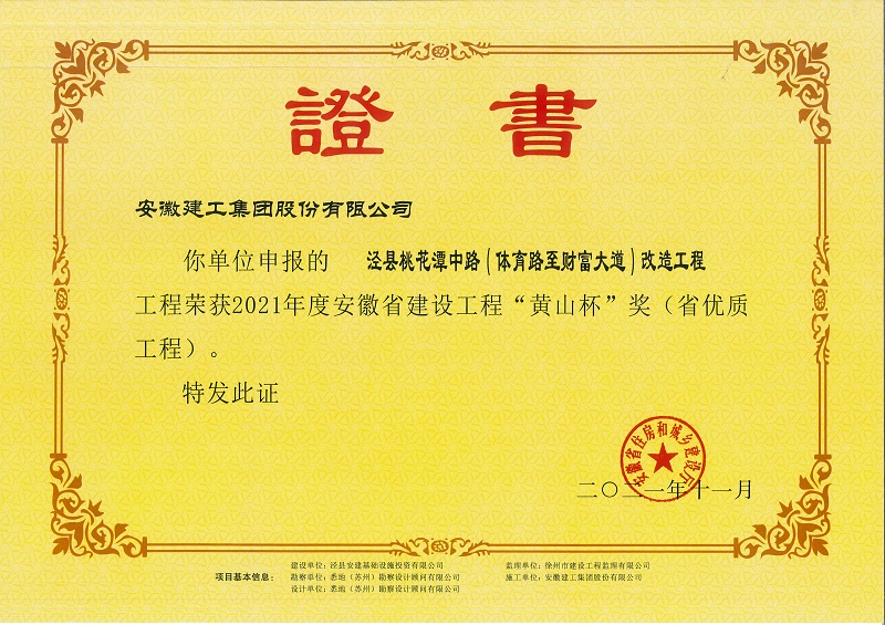 近日,安建投資涇縣生態(tài)文明提升基礎(chǔ)設(shè)施建設(shè)PPP項目桃花潭中路改造工程喜獲2021年度安徽省建設(shè)工程“黃山杯”獎(省優(yōu)質(zhì)工程)。
