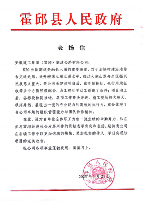 【“投”條喜報(bào)】建工投資S20長(zhǎng)固高速霍邱至皖豫界段項(xiàng)目喜獲霍邱縣人民政府通報(bào)表?yè)P(yáng)