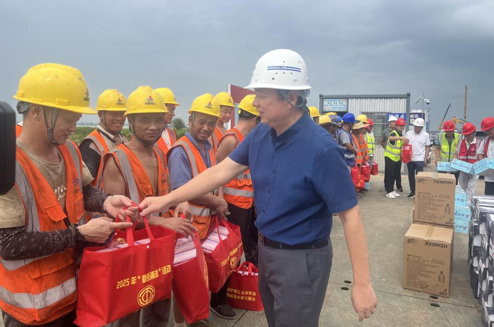 張彥詳細了解當前工程進度情況,并為一線施工人員送去防暑降溫物品。他強調(diào),一方面各施工單位要做好高溫作業(yè)時間安排,務必保證勞動工作者身心健康,另一方面,全體參建單位要加快推進項目建設進度,落實安全管理措施,確保高效完成工程建設任務。