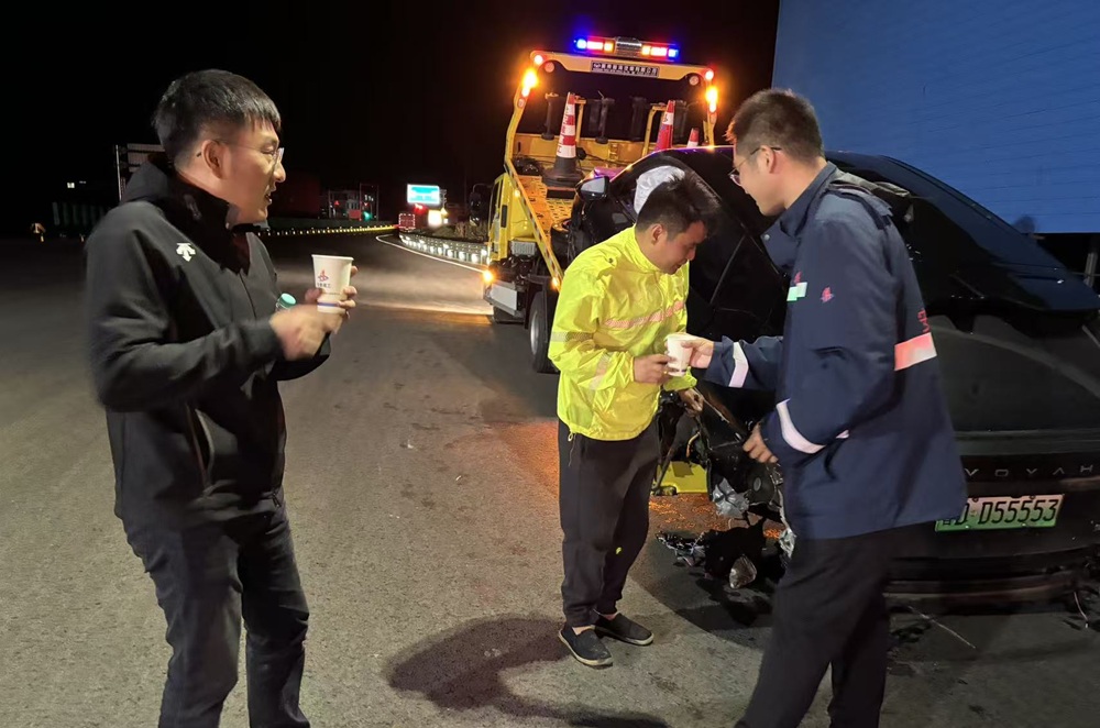 10月20日晚,蕭縣北收費站外廣場出現一幕險情:一輛嚴重損毀的小客車被拖運至此。值班人員見狀,迅速在事故車輛周圍規范擺放錐筒,設立安全區域。并上前為驚魂未定的車主與應急人員遞上熱水。
