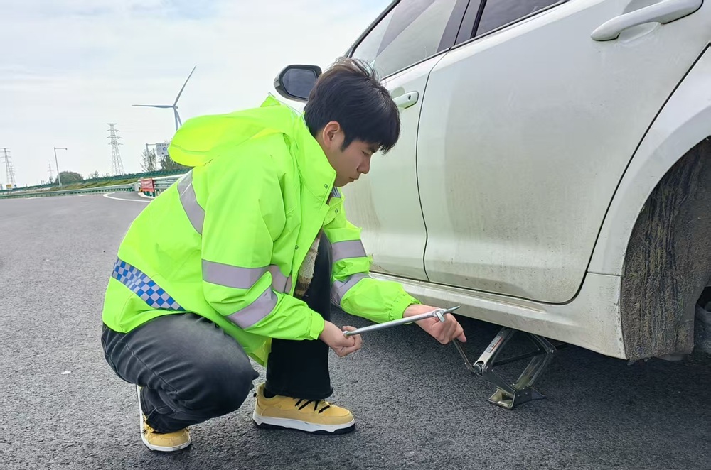 收費員陳寬寬毫不猶豫俯身跪地,熟練地拆卸螺絲、支起千斤頂、更換備胎……整個過程干凈利落,班組人員還貼心為其余輪胎進行胎壓檢測,全面排除安全隱患,以實際行動守護行車平安。